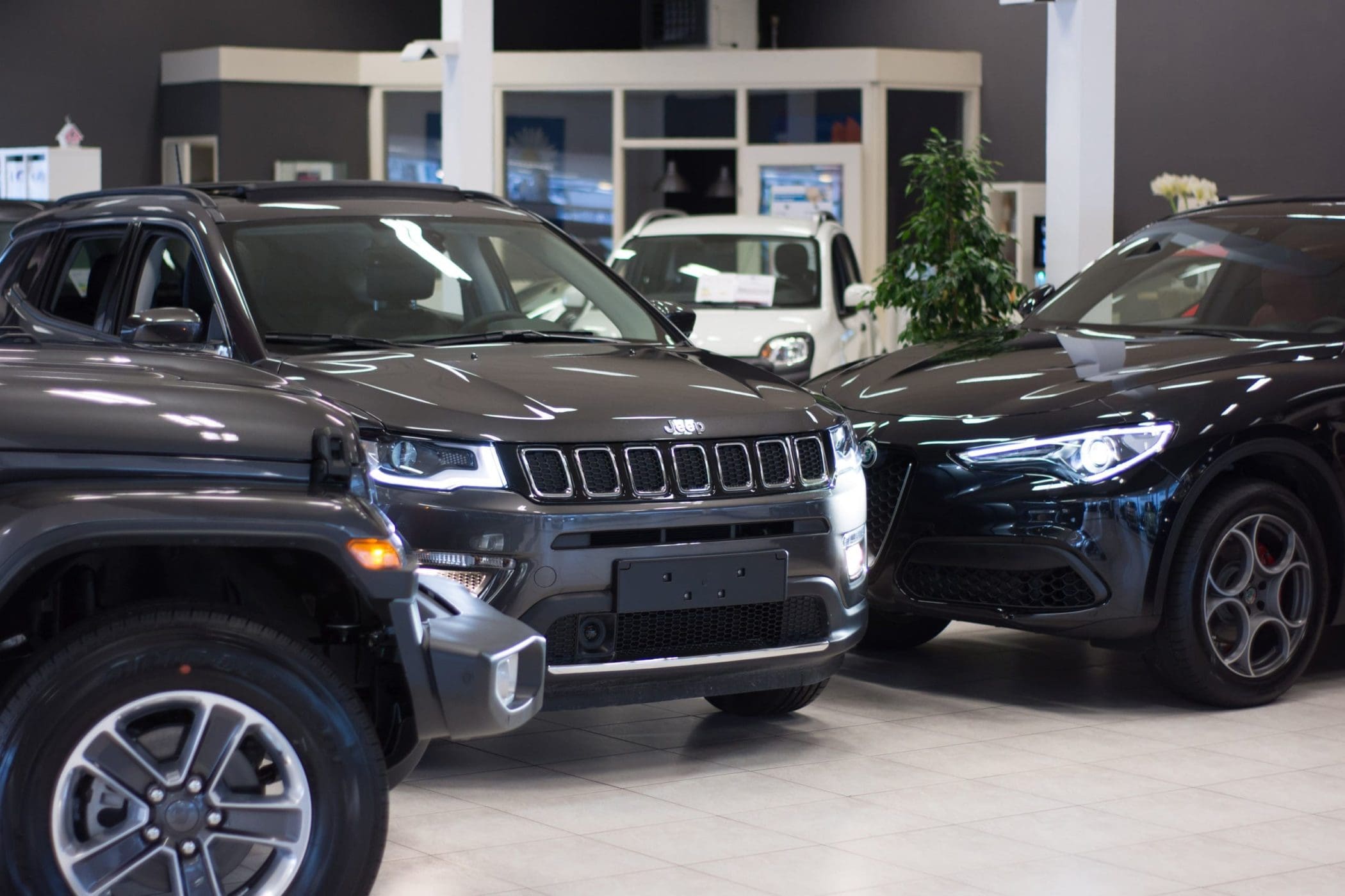 Jeep compass donker grijs voorkant showroom