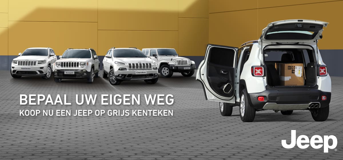 De Jeep Renegade is voor de veeleisende zakelijke rijder ook leverbaar op grijs kenteken. Nooit eerder was het zo aantrekkelijk om een Jeep op grijs kenteken te rijden. Wie voor 15 januari 2016 zakelijk een Renegade Van aanschaft betaalt geen extra kosten voor de ombouw naar grijs kenteken. Dit is een voordeel van € 3.000,- excl. btw.