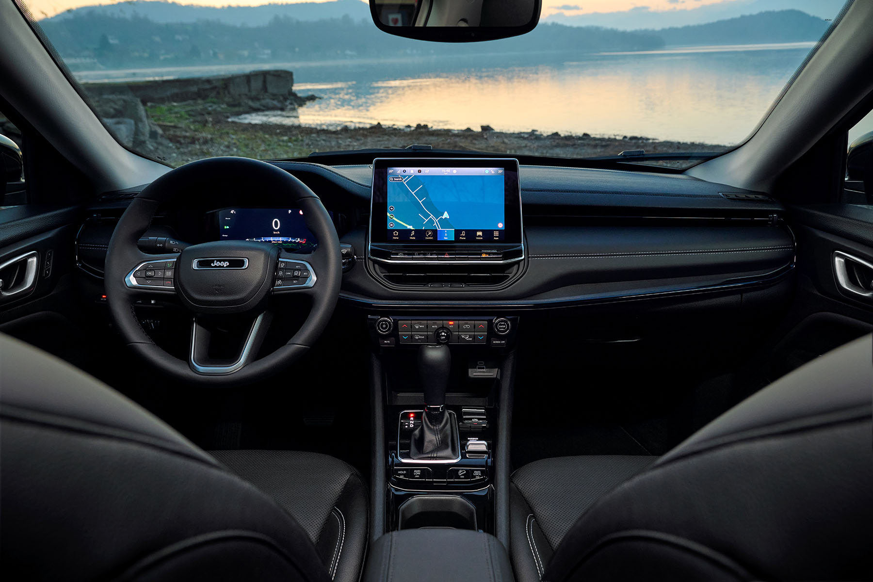 Off-road skills gecombineerd met ongekend comfort. Geniet van de lederen en geventileerde stoelen en het tweedelig panoramisch schuif-kanteldak van de Compass 4xe Plug-in Hybrid.
